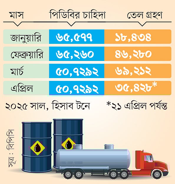 তবে বিপিসি সূত্র বলছে, জ্বালানি বিভাগের চিঠির পর ১৯ ও ২০ এপ্রিল মাত্র ৫ হাজার টন তেল নিয়েছে পিডিবি। ২১ এপ্রিল পর্যন্ত এ মাসে পিডিবি মোট তেল নিয়েছে ৩৫ হাজার ৪২৮ টন।