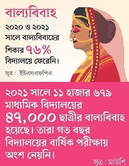 ১৮ সেপ্টেম্বর জাতিসংঘের জনসংখ্যা তহবিল (ইউএনএফপিএ) ‘বাংলাদেশে কোভিড-১৯ মহামারির সময়ে বাল্যবিবাহ’ শিরোনামে জরিপ প্রতিবেদন প্রকাশ করে। ওই প্রতিবেদন অনুসারে, ২০২০ ও ২০২১ করোনা মহামারির দুই বছরে বাল্যবিবাহের শিকার মেয়েদের ৭৬ শতাংশ আর বিদ্যালয়ে ফেরেনি।