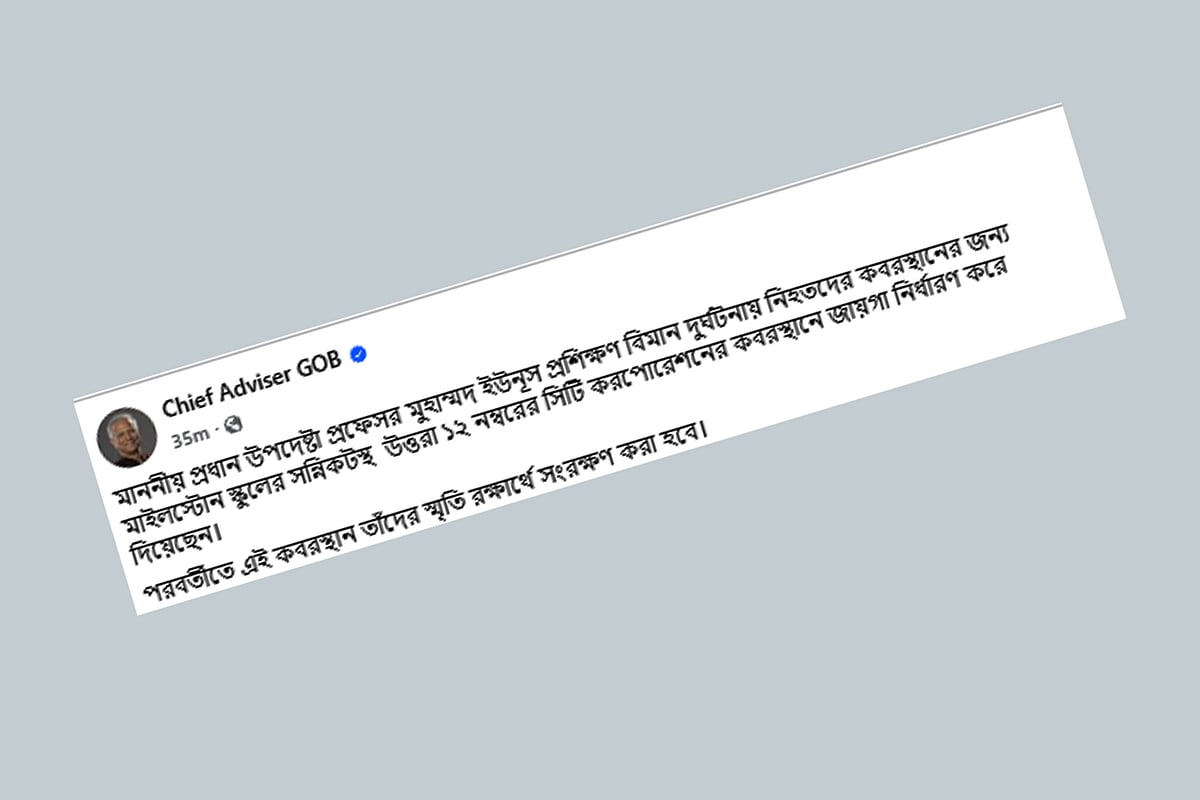 পোস্টে বলা হয়েছে, বিমান দুর্ঘটনায় নিহত ব্যক্তিদের কবরস্থানের জন্য মাইলস্টোন স্কুলের কাছের উত্তরা ১২ নম্বরের সিটি করপোরেশনের কবরস্থানে জায়গা নির্ধারণ করে দিয়েছেন প্রধান উপদেষ্টা।