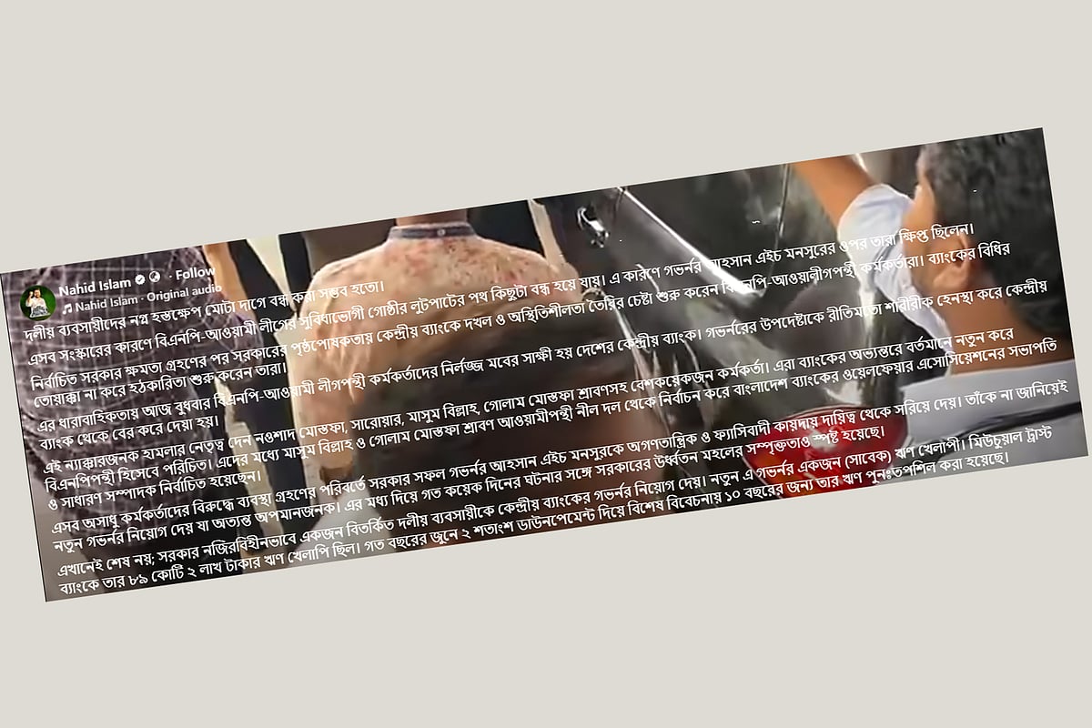 নাহিদ পোস্টে আরও লেখেন, ‘এর ধারাবাহিকতায় বুধবার বিএনপি-আওয়ামী লীগপন্থী কর্মকর্তাদের নির্লজ্জ মবের সাক্ষী হয় দেশের কেন্দ্রীয় ব্যাংক। গভর্নরের উপদেষ্টাকে রীতিমতো শারীরিক হেনস্থা করে কেন্দ্রীয় ব্যাংক থেকে বের করে দেওয়া হয়। এই ন্যক্কারজনক হামলার নেতৃত্ব দেন নওশাদ মোস্তফা, সারোয়ার, মাসুম বিল্লাহ, গোলাম মোস্তফা শ্রাবণসহ বেশ কয়েকজন কর্মকর্তা। এরা ব্যাংকের অভ্যন্তরে বর্তমানে নতুন করে বিএনপিপন্থী হিসেবে পরিচিত। এদের মধ্যে মাসুম বিল্লাহ ও গোলাম মোস্তফা শ্রাবণ আওয়ামীপন্থী নীল দল থেকে নির্বাচন করে বাংলাদেশ ব্যাংকের ওয়েলফেয়ার এসোসিয়েশনের সভাপতি ও সাধারণ সম্পাদক নির্বাচিত হয়েছেন।’