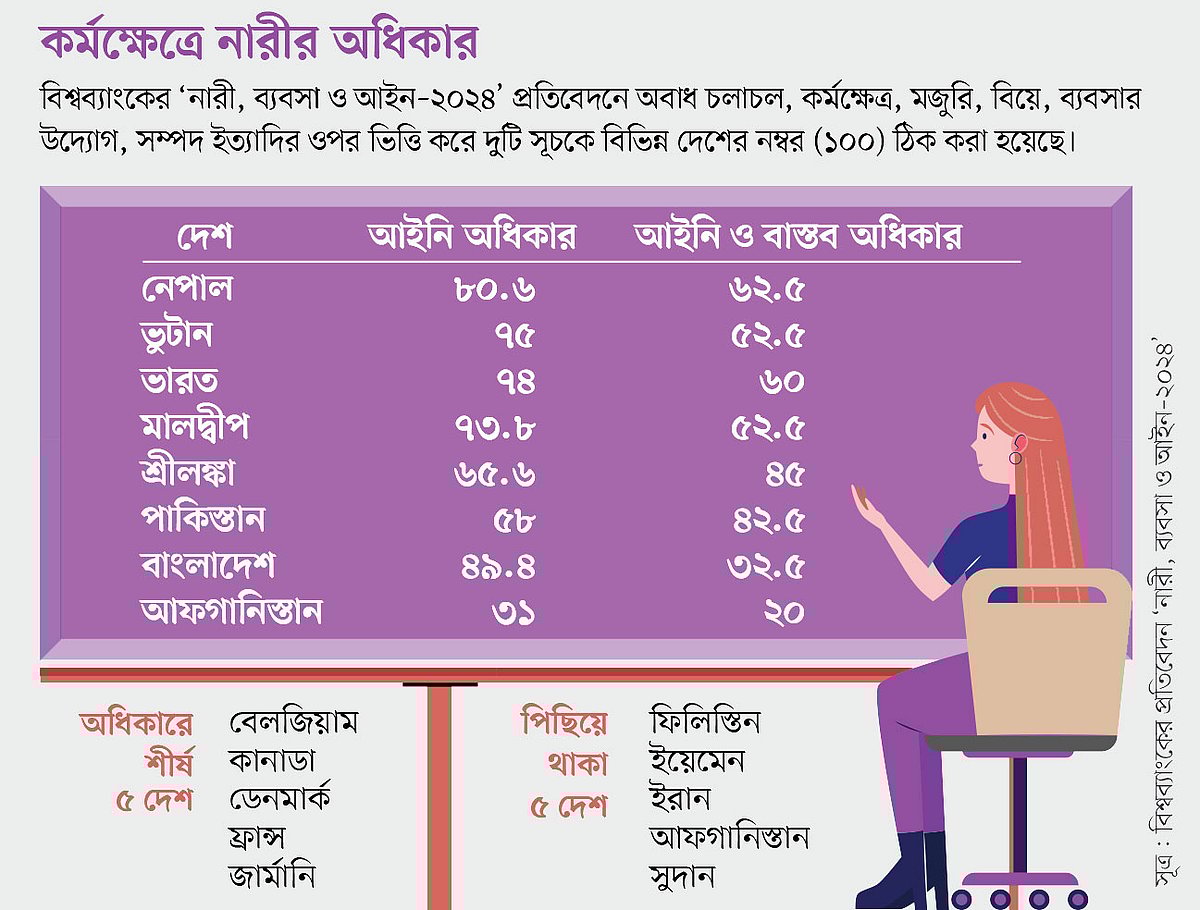 কর্মক্ষেত্রে বাংলাদেশের নারীরা পুরুষের তিন ভাগের এক ভাগ আইনি অধিকার ভোগ করেন। এ ক্ষেত্রে দক্ষিণ এশিয়ার অন্য দেশগুলোর চেয়ে পিছিয়ে বাংলাদেশ। বাংলাদেশের পেছনে আছে শুধু আফগানিস্তান।