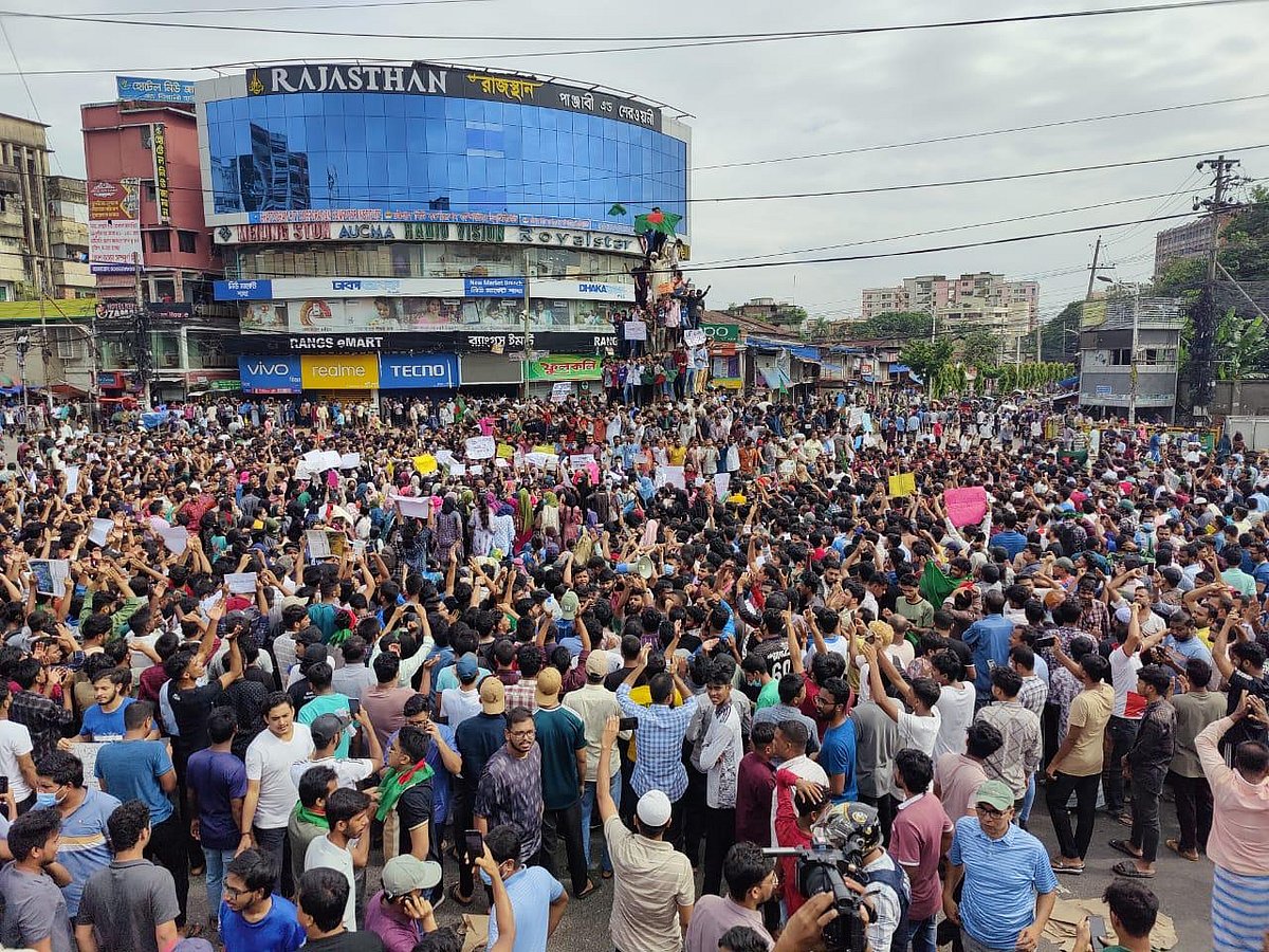 সারা দেশে ছাত্র-জনতার শান্তিপূর্ণ আন্দোলনে হামলা করে খুনের প্রতিবাদে এবং নয় দফা দাবিতে এ বিক্ষোভ করা হচ্ছে। সরেজমিন দেখা যায়, বেলা আড়াইটা থেকে শিক্ষার্থীরা ছোট ছোট দলে বিভক্ত হয়ে নিউমার্কেটের আশপাশের জড়ো হচ্ছিলেন। পরে বেলা পৌনে তিনটার দিকে শিক্ষার্থীরা মিছিল নিয়ে নিউমার্কেট মোড় অবরোধ করেন। এ কারণে সেখানে যান চলাচল বন্ধ রয়েছে।