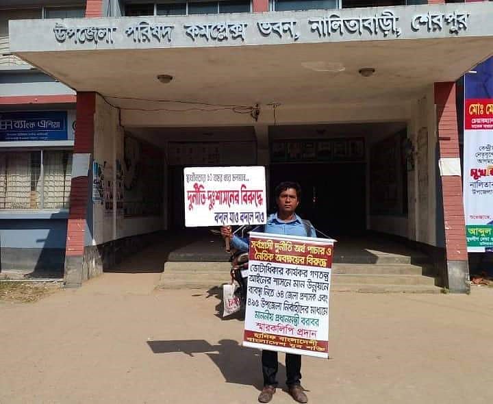 দেশে চলমান দুর্নীতি ও দুঃশাসনের বিরুদ্ধে ভিন্নধর্মী প্রতিবাদ কর্মসূচি পালন করছেন মো. হানিফ ওরফে ‘হানিফ বাংলাদেশি’। আজ বুধবার সকালে হানিফ ময়মনসিংহ জেলার হালুয়াঘাট থেকে নালিতাবাড়ী উপজেলায় পৌঁছে তিনি উপজেলা নির্বাহী কর্মকর্তা খ্রিষ্টফার হিমেল রিছিলের মাধ্যমে প্রধানমন্ত্রীর কাছে স্মারকলিপি দেন।