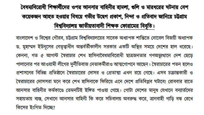 বৈষম্যবিরোধী ছাত্র আন্দোলনের শিক্ষার্থীদের ওপর আনসার সদস্যদের হামলার নিন্দা ও প্রতিবাদ জানিয়েছে চট্টগ্রাম বিশ্ববিদ্যালয়ের জাতীয়তাবাদী শিক্ষক ফোরাম। হামলায় জড়িত ব্যক্তিদের দ্রুত আইনের আওতায় এনে বিচারের দাবি জানিয়েছে তারা।