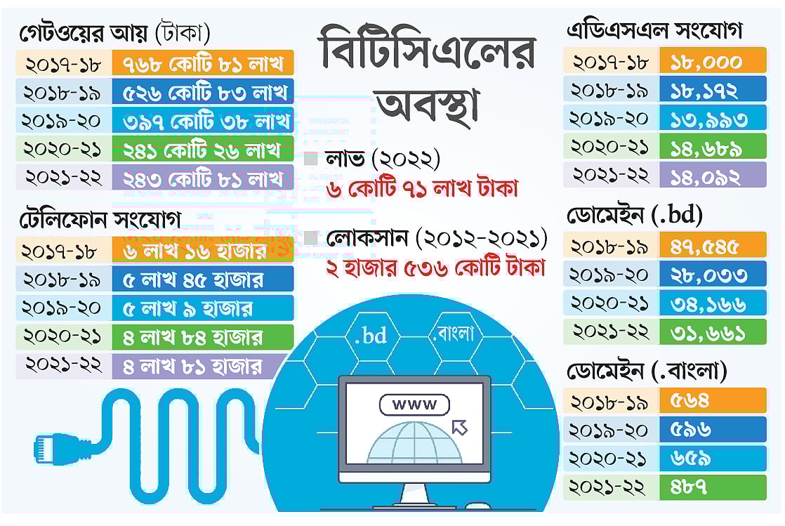 কর্মকর্তারা বলেন, করোনাকালে ইন্টারনেটের চাহিদা বেড়ে যাওয়ায় বিটিসিএল লাভে ফিরেছিল। তবে যেসব সেবা ভালো আয় করছিল, সেসবের প্রবৃদ্ধিও থামকে গেছে।