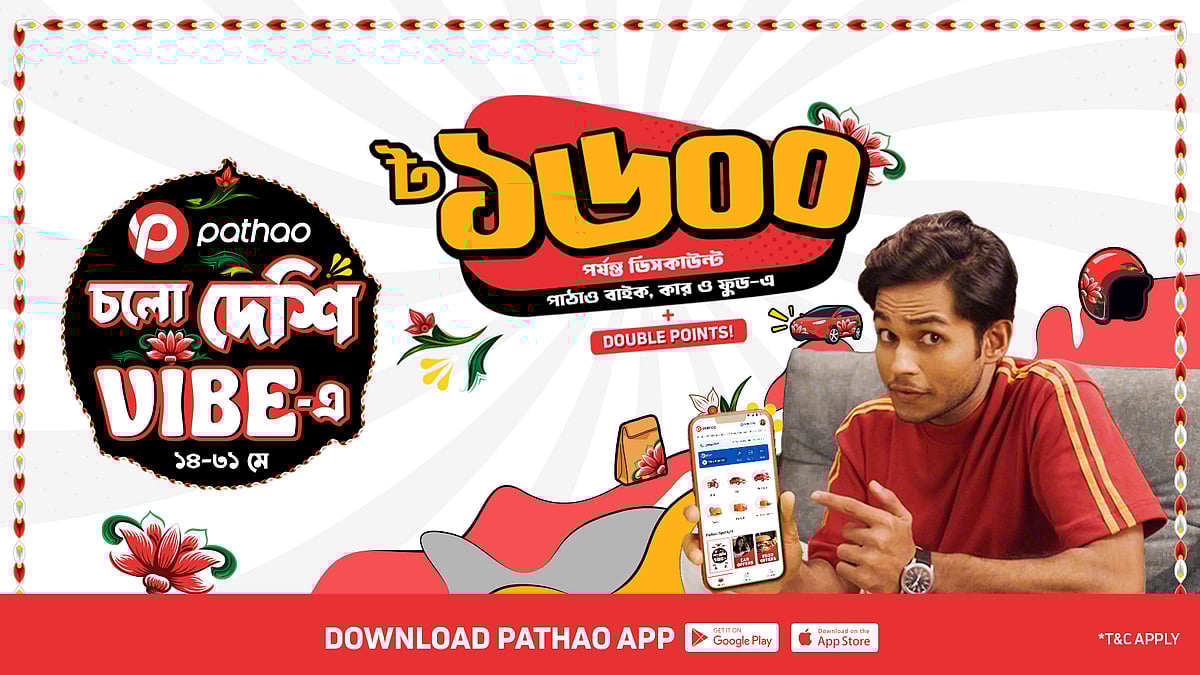 ‘চলো দেশি Vibe-এ’ হলো দেশীয় প্রাইড আর একসঙ্গে উদ্যাপনের আনন্দ। এই মে মাসে রাইড দিন, খাবার অর্ডার করুন, প্রিয়জনকে পার্সেল পাঠান, আর পাঠাও-এর সঙ্গে চলুন দেশি ভাইবে।