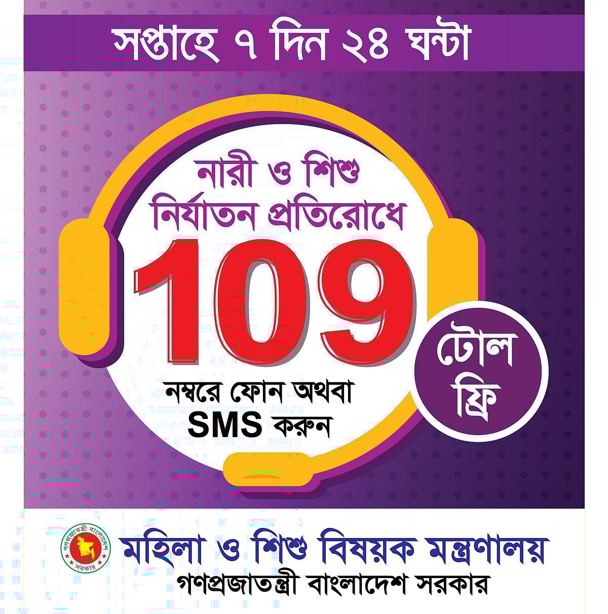 নারী ও শিশু নির্যাতনের ঘটনায় তাৎক্ষণিক ব্যবস্থা নিতে মহিলা ও শিশুবিষয়ক মন্ত্রণালয়ের ‘নারী ও শিশু নির্যাতন প্রতিরোধকল্পে বহুমুখী কর্মসূচি’র আওতায় ৯টি প্রকল্প চলমান। এর একটি হচ্ছে, ১০৯–এর মাধ্যমে ভুক্তভোগীদের সেবা দেওয়া। ২০১২ সালের শুরুতে ১০৯২১ নম্বরের মাধ্যমে এই হেল্পলাইন চালু করা হয়। ২০১৭ সালে নম্বরটি পরিবর্তন করে করা হয় ১০৯। ২০১৪ সাল থেকে এটি ‘টোল ফ্রি’ অর্থাৎ বিনা মূল্যে কল করা যায়। তবে খুদে বার্তা পাঠালে গুনতে হয় অর্থ।