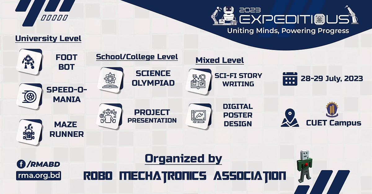 চট্টগ্রাম প্রকৌশল ও প্রযুক্তি বিশ্ববিদ্যালয়ে (চুয়েট) ২৮ থেকে ২৯ জুলাই, ২০২৩ রোবো মেকাট্রনিকস অ্যাসোসিয়েশন, বাংলাদেশ (আরএমএ) আয়োজন করতে যাচ্ছে জাতীয় পর্যায়ের রোবোটিকস ও বিজ্ঞান উৎসব। রোবো মেকাট্রনিকস অ্যাসোসিয়েশন, বিশ্ববিদ্যালয় পর্যায়ে বাংলাদেশের অন্যতম বড় এবং প্রবীণ রোবোটিকস সংগঠন। আর এ উৎসব হতে যাচ্ছে এযাবৎকালের মধ্যে চট্টগ্রামে আয়োজিত সবচেয়ে বড় রোবোটিকস ও বিজ্ঞান উৎসব।