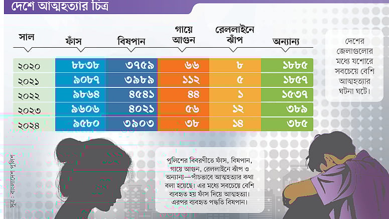 গতকাল সোমবার রাজধানীতে আন্তর্জাতিক উদরাময় গবেষণা কেন্দ্র বাংলাদেশে (আইসিডিডিআরবি) আয়োজিত এক অনুষ্ঠানে পুলিশের অতিরিক্ত উপমহাপরিদর্শক (ক্রাইম) মো. আশরাফুল ইসলাম এ তথ্যের উল্লেখ করেন। তিনি বলেন, দেশের জেলাগুলোর মধ্যে যশোরে সবচেয়ে বেশি আত্মহত্যার ঘটনা ঘটে।