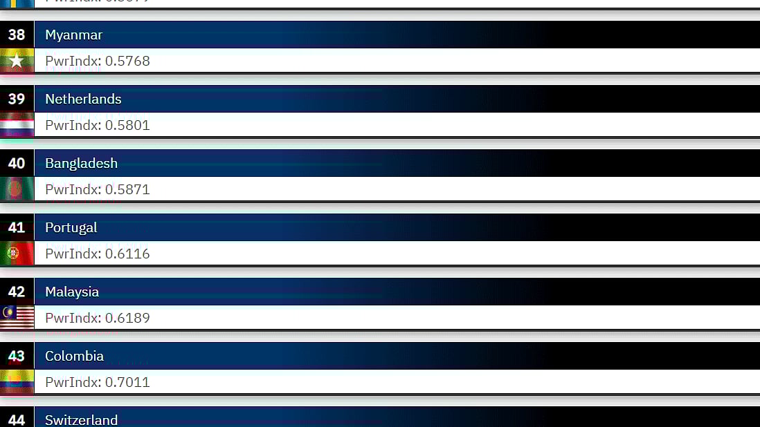 বাংলাদেশের প্রতিবেশী দেশগুলোর মধ্যে তালিকায় ভারত চতুর্থ, পাকিস্তান সপ্তম, মিয়ানমার ৩৮তম, শ্রীলঙ্কা ৭১তম ও নেপাল ১২৯তম অবস্থানে রয়েছে। তালিকার সবচেয়ে শেষে ১৮৫তম অবস্থানে রয়েছে ভুটান। শক্তিমত্তার সূচকে দেশটির স্কোর ৬ দশমিক ২০১৭।