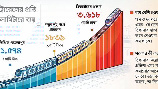 নতুন পথটিতে মেট্রোরেল নির্মাণে জাপানি ঠিকাদারেরা কিলোমিটারপ্রতি যে টাকা চাইছে, তা সরকারের প্রাক্কলনের চেয়ে প্রায় ৯৭ শতাংশ বেশি। অন্তর্বর্তী সরকারের আমলে ঠিকাদারদের ব্যয় প্রস্তাব ধরে বিশ্লেষণ করে দেখা গিয়েছিল, প্রতি কিলোমিটারে খরচ দাঁড়াবে প্রায় ৩ হাজার ৬১৮ কোটি টাকা। সরকার ধরেছিল, ব্যয় হবে ১ হাজার ৮৩৯ কোটি টাকা। অন্যদিকে ঢাকার উত্তরা থেকে মতিঝিল পথে মেট্রোরেল নির্মাণে ব্যয় হয়েছে দেড় হাজার কোটি টাকার মতো।