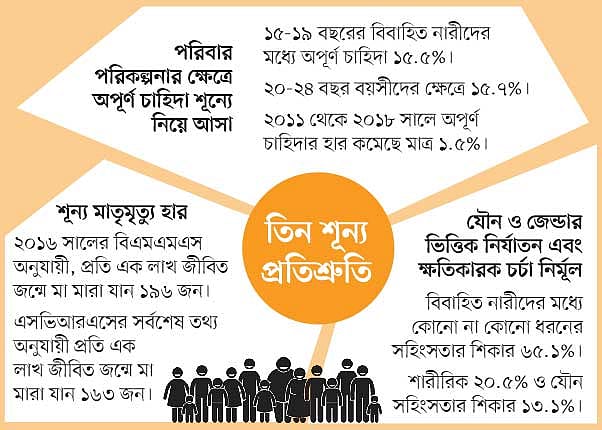 ২০৩০ সালের মধ্যে তিন শূন্য লক্ষ্যমাত্রা অর্জন বাংলাদেশের জন্য নিঃসন্দেহে বড় চ্যালেঞ্জ। করোনা মহামারির কারণে পরিবার পরিকল্পনা পদ্ধতি ব্যবহার, মাতৃস্বাস্থ্য ও জেন্ডারভিত্তিক সহিংসতা ও বাল্যবিবাহ পরিস্থিতি কোথায় গিয়ে দাঁড়িয়েছে, সেটা স্পষ্টভাবে জানার জন্য জাতীয় গবেষণা প্রয়োজন। তবে বিদ্যমান তথ্য-উপাত্ত বিশ্লেষণে এটি প্রতীয়মান যে মহামারির প্রাদুর্ভাবের সময়ে প্রজনন স্বাস্থ্যসেবা বাধার সম্মুখীন হয়েছে।