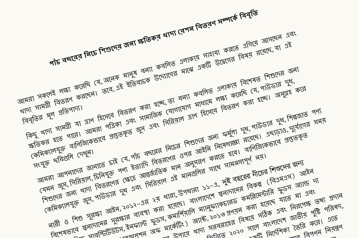 বিবৃতিদাতারা বলেছেন, তাঁরা পত্রিকা ও সামাজিক যোগাযোগমাধ্যমে লক্ষ করেছেন যে বন্যাকবলিত এলাকায় গুঁড়া দুধ, রাসায়নিকযুক্ত তরল ও গুঁড়া খাবার বিতরণ করা হচ্ছে। তাঁরা আরও বলেছেন, পাঁচ বছরের কম বয়সী শিশুদের জন্য কৃত্রিম দুধ, গুঁড়া দুধ, শিল্পজাত পণ্য, চিনিযুক্ত পণ্য বিতরণের ক্ষেত্রে আইনি নিষেধাজ্ঞা আছে। দুর্যোগের সময় শিশুখাদ্য বিতরণে আন্তর্জাতিক মান অনুসরণ করতে হয়। কিন্তু বন্যাকবলিত এলাকায় তা করা হচ্ছে না।