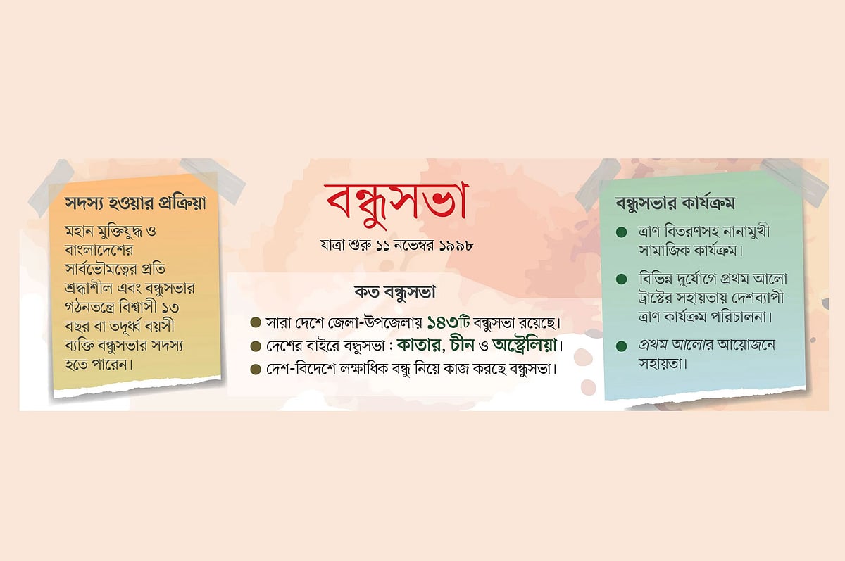 প্রথম আলোর প্রতিষ্ঠাবার্ষিকী উপলক্ষেও বন্ধুরা যুক্ত হন ভালো কাজের লড়াইয়ে। কেউ অসহায় পরিবারের হাতে তুলে দিচ্ছেন সেলাই মেশিন, কেউ দিচ্ছেন গবাদিপশু, কেউ তৈরি করে দিচ্ছেন নতুন দোকানঘর আবার কেউবা তুলে দিচ্ছেন আস্ত বসতবাড়ি! শিশুদের জন্য কোনো বন্ধুসভা স্কুল করছে তো আরেক বন্ধুসভা উপহার দিচ্ছে শিক্ষাসামগ্রী। এভাবেই বন্ধুরা একে অন্যের হাত ধরে এগিয়ে যাচ্ছেন সুন্দর এক ভবিষ্যতের দিকে। তারুণ্যের সংহতিতে সতেজ প্রাণে লাখো কণ্ঠে ধ্বনিত হচ্ছে একই সুর—বন্ধু মানেই সংহতি, বন্ধু মানেই ইতিবাচক পরিবর্তনের পথে এক ধাপ অগ্রগতি। জয় হোক প্রথম আলোর, জয় হোক বন্ধুসভার, জয় হোক তারুণ্যের।