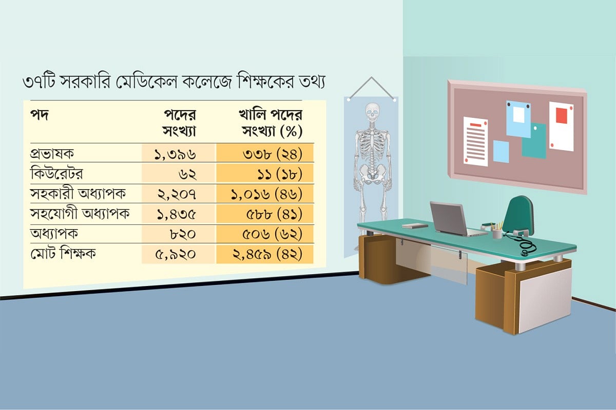 স্বাস্থ্য শিক্ষা অধিদপ্তরের সর্বশেষ হিসাব অনুযায়ী, সারা দেশে মেডিকেল শিক্ষায় সরকারি কলেজে মৌলিক ও ক্লিনিক্যাল বিষয়ে শিক্ষকের পদ আছে ৫ হাজার ৯২০টি। এর মধ্যে শিক্ষক নেই ২ হাজার ৪৫৯টি পদে। এর মধ্যে আটটি মৌলিক বিষয়ে ২৯ শতাংশ শিক্ষকের পদ খালি, অন্যান্য ক্লিনিক্যাল বিষয়ে ৪৮ শতাংশ পদ খালি। সামগ্রিকভাবে ৪২ শতাংশ শিক্ষকের পদ খালি।