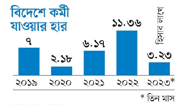 বিএমইটির তথ্য বলছে, ২০২২ সালে বাংলাদেশ থেকে বিভিন্ন দেশে কাজের উদ্দেশ্যে যান প্রায় ১১ লাখ ৩৬ হাজার জন। দেশের ইতিহাসে এক বছরে বিদেশে যাওয়ার ক্ষেত্রে এটি রেকর্ড। এর আগে ২০১৭ সালে বিদেশে যান ১০ লাখের কিছু বেশি কর্মী। এদিকে চলতি বছরের প্রথম তিন মাসে বিদেশে গেছেন ৩ লাখ ২৩ হাজার জন।