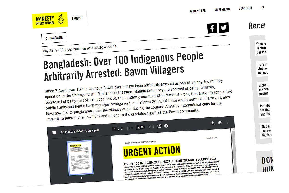 অ্যামনেস্টি ইন্টারন্যাশনাল বলছে, ‘গত এপ্রিলে বান্দরবানে দুটি ব্যাংকে ডাকাতি এবং এক ব্যাংকের ব্যবস্থাপককে অপহরণের ঘটনা ঘটে। এরপর পার্বত্য চট্টগ্রামে অভিযান শুরু করে সামরিক বাহিনী। সে অভিযান চলছে। গত ৭ এপ্রিল থেকে বম জনগোষ্ঠীর শতাধিক ব্যক্তিকে নির্বিচার গ্রেপ্তার করা হয়েছে। তাঁদের মধ্যে শিশুসহ এক অন্তঃসত্ত্বা নারীও আছেন। বেসামরিক এসব নাগরিককে অবিলম্বে মুক্তি দিন।’