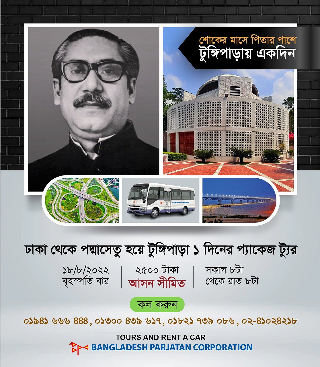 পদ্মা সেতু হয়ে এবার গোপালগঞ্জের টুঙ্গিপাড়ায় এক দিনের ভ্রমণ প্যাকেজ ঘোষণা করেছে বাংলাদেশ পর্যটন করপোরেশন। ১৮ আগস্ট পর্যটকদের নিয়ে টুঙ্গিপাড়ায় যাবে তারা। ওই দিন সকাল ৮টায় রাজধানীর আগারগাঁওয়ের পর্যটন ভবন থেকে পর্যটকদের নিয়ে যাত্রা শুরু হবে এবং রাত ৮টায় ফিরে আসবে। এতে জনপ্রতি খরচ হবে ২ হাজার ৫০০ টাকা।