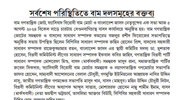 সভায় বক্তারা গণ-অভ্যুত্থানের মাধ্যমে শেখ হাসিনার পদত্যাগকে জনগণের বিজয় হিসেবে উল্লেখ করেন। তাঁরা বাম গণতান্ত্রিক জোট, ফ্যাসিবাদবিরোধী বাম মোর্চা ও বাংলাদেশ জাসদসহ আন্দোলনকারী সব গণতান্ত্রিক ছাত্র ও রাজনৈতিক শক্তির সঙ্গে আলোচনা ও মতামতের ভিত্তিতে অন্তর্বর্তীকালীন সরকার গঠন ও ক্ষমতা হস্তান্তরের আহ্বান জানান। সারা দেশে শান্তিশৃঙ্খলা রক্ষা, ধর্মীয় ও জাতিগত সংখ্যালঘু সম্প্রদায়সহ সব মানুষের জানমালের নিরাপত্তা রক্ষায় ভূমিকা নিতে সচেতন দেশবাসীর প্রতি আহ্বান জানানো হয়। পূর্ণ গণতান্ত্রিক অধিকার অর্জিত না হওয়া পর্যন্ত আন্দোলন চলিয়ে যাওয়ার ঘোষণা দেওয়া হয়।