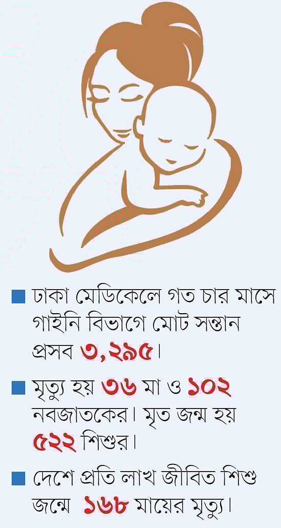 ঢাকা মেডিকেল কলেজ হাসপাতালের তথ্যমতে, চলতি বছরের জানুয়ারি থেকে এপ্রিল পর্যন্ত চার মাসে গাইনি বিভাগে মোট ৩ হাজার ২৯৫ সন্তান প্রসব হয়। এর মধ্যে ৩৬ জন মা ও ১০২টি নবজাতকের মৃত্যু হয়। আর মৃত অবস্থায় জন্ম হয় ৫২২ শিশুর।
