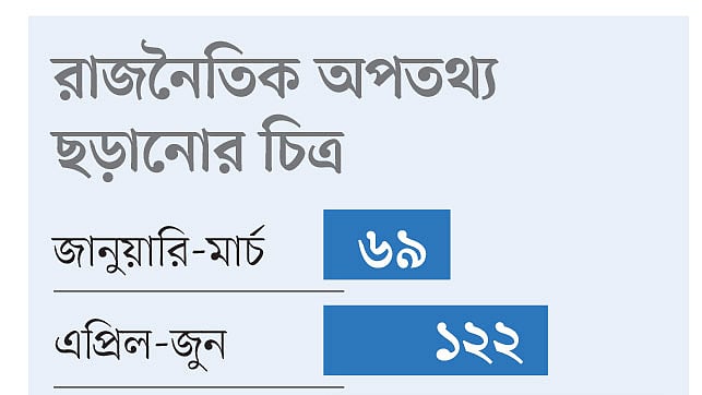 ডিসমিসল্যাব নামের একটি প্রতিষ্ঠান সাতটি ফ্যাক্টচেকার (তথ্য যাচাইকারী) প্রতিষ্ঠানের তথ্য বিশ্লেষণ করে দেখিয়েছে, চলতি বছরের জানুয়ারি-মার্চ সময়ের তুলনায় এপ্রিল-জুন সময়ে রাজনৈতিক ভুল তথ্য ছড়ানো বেড়েছে ৭৪ শতাংশ। জুলাই-সেপ্টেম্বর সময়ে রাজনৈতিক ভুল তথ্য ছড়ানো আগের তিন মাসের তুলনায় ৫৬ শতাংশ বেড়েছে।