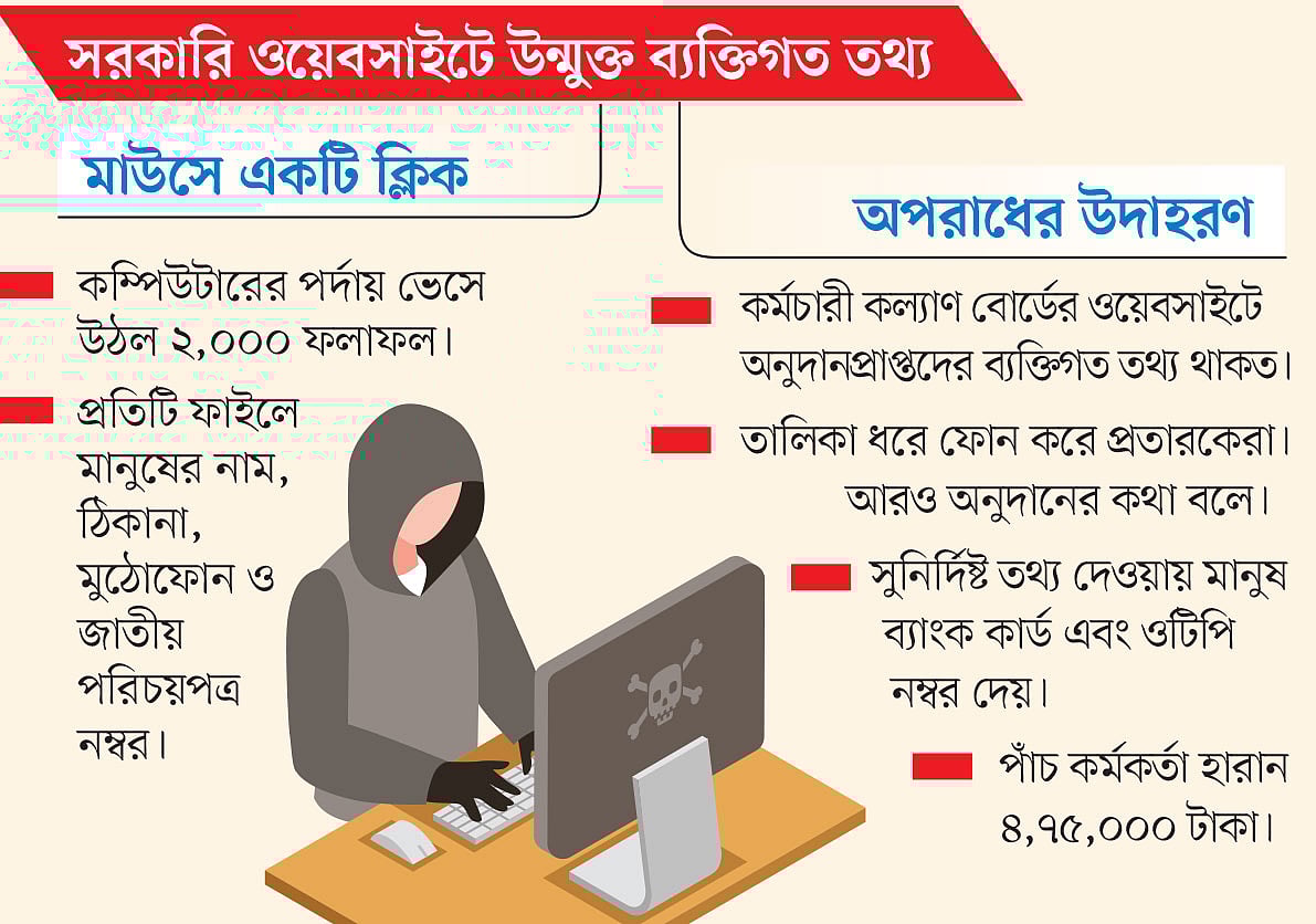 উন্মুক্ত তথ্যের কারণে প্রতারণার শিকার হয়েছিলেন যে সরকারি কর্মকর্তারা, তাঁদের তিনজনের সঙ্গে কথা বলেছে প্রথম আলো। তাঁরা জানান, তাঁদের ফোন করে কর্মচারী কল্যাণ বোর্ডের কর্মকর্তা পরিচয় দিয়ে বলা হয়েছিল তারা আরও অনুদান পাবেন। এ জন্য ব্যাংক কার্ডের নম্বর দরকার তাৎক্ষণিকভাবে।