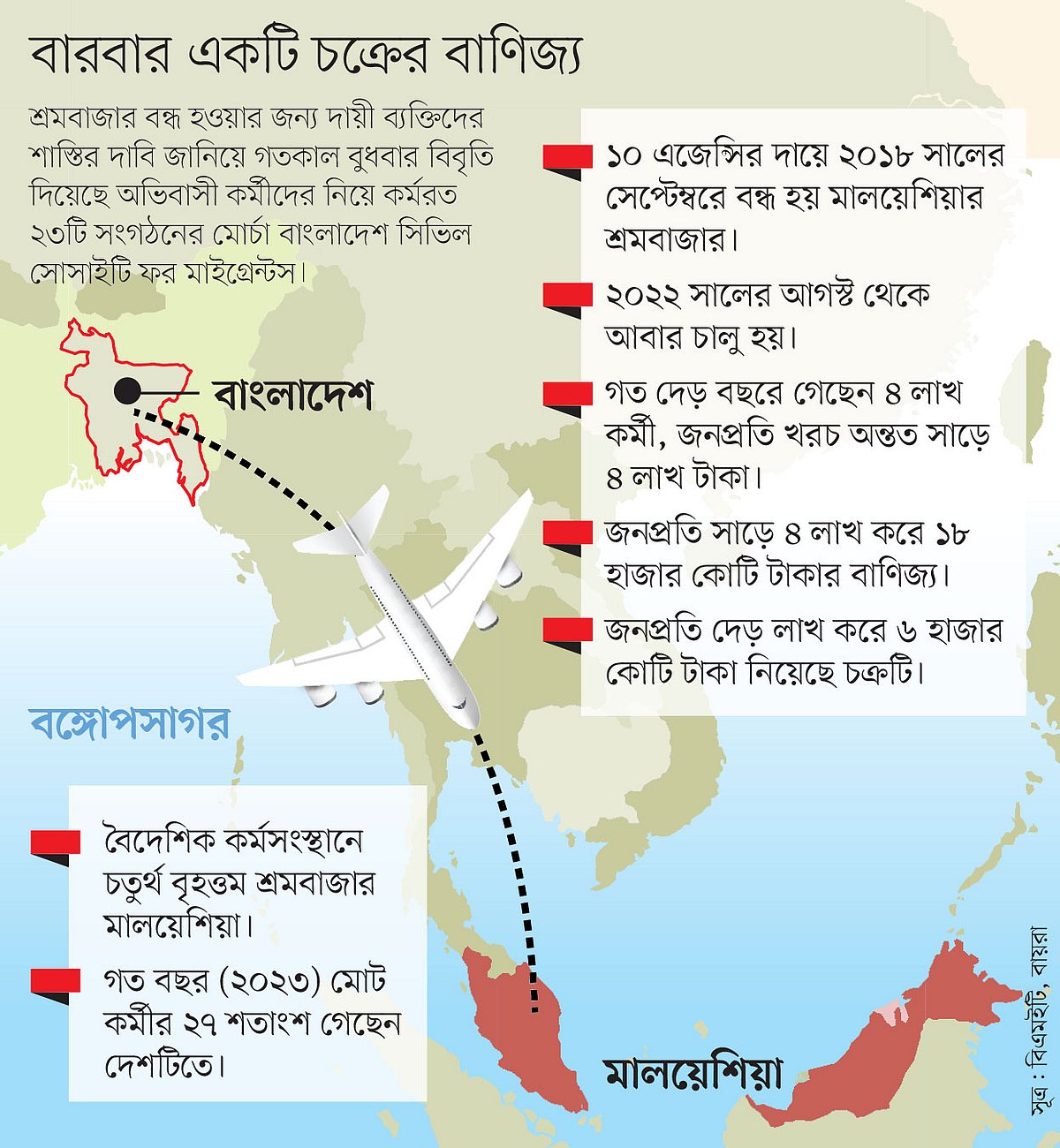 বাংলাদেশ অ্যাসোসিয়েশন অব ইন্টারন্যাশনাল রিক্রুটিং এজেন্সিজের (বায়রা) সদস্যরা বলছেন, সবাইকে সুযোগ দিলে প্রতিযোগিতার কারণে অভিবাসন খরচ কমে আসত। কিন্তু দুই দেশের মধ্যে স্বাক্ষরিত সমঝোতা স্মারকে এজেন্সি চূড়ান্ত করার দায়িত্ব মালয়েশিয়ার হাতে দেওয়া হয়। এতে একটি নির্দিষ্ট গোষ্ঠী অবৈধ বাণিজ্যের সুযোগ পেয়েছে। একজন কর্মীর জন্য শুধু চক্র নিয়েছে দেড় লাখ টাকা। চার লাখের বেশি কর্মী পাঠিয়ে ছয় হাজার কোটি টাকার বেশি নিয়েছে এ চক্র। গত দেড় বছরেই মালয়েশিয়ার শ্রমবাজার নিয়ে ১৮ হাজার কোটি টাকার বাণিজ্য হয়েছে।