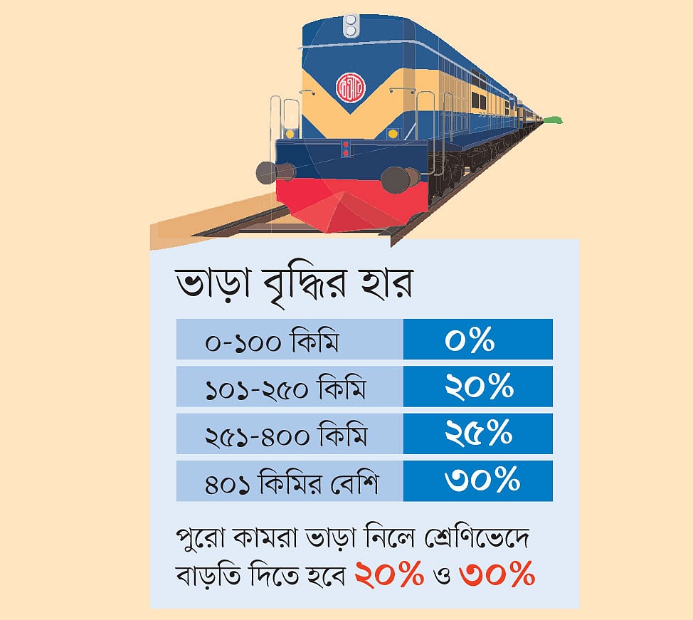 রেলের কর্মকর্তারা প্রাথমিক যে হিসাব করেছেন, তাতে ঢাকা থেকে চট্টগ্রাম পর্যন্ত শোভন শ্রেণির ভাড়া বাড়বে ৬০ টাকা। এসি স্নিগ্ধা শ্রেণির ভাড়া ১২০ টাকার মতো বাড়তে পারে। আর এসি কামরায় ঘুমিয়ে যাওয়ার (বার্থ) ভাড়া বাড়বে ২১৬ টাকার মতো। তবে ঢাকা থেকে নরসিংদী, জয়দেবপুর, ফরিদপুরসহ কম দূরত্বের কোনো ট্রেনেই ভাড়া বাড়বে না।