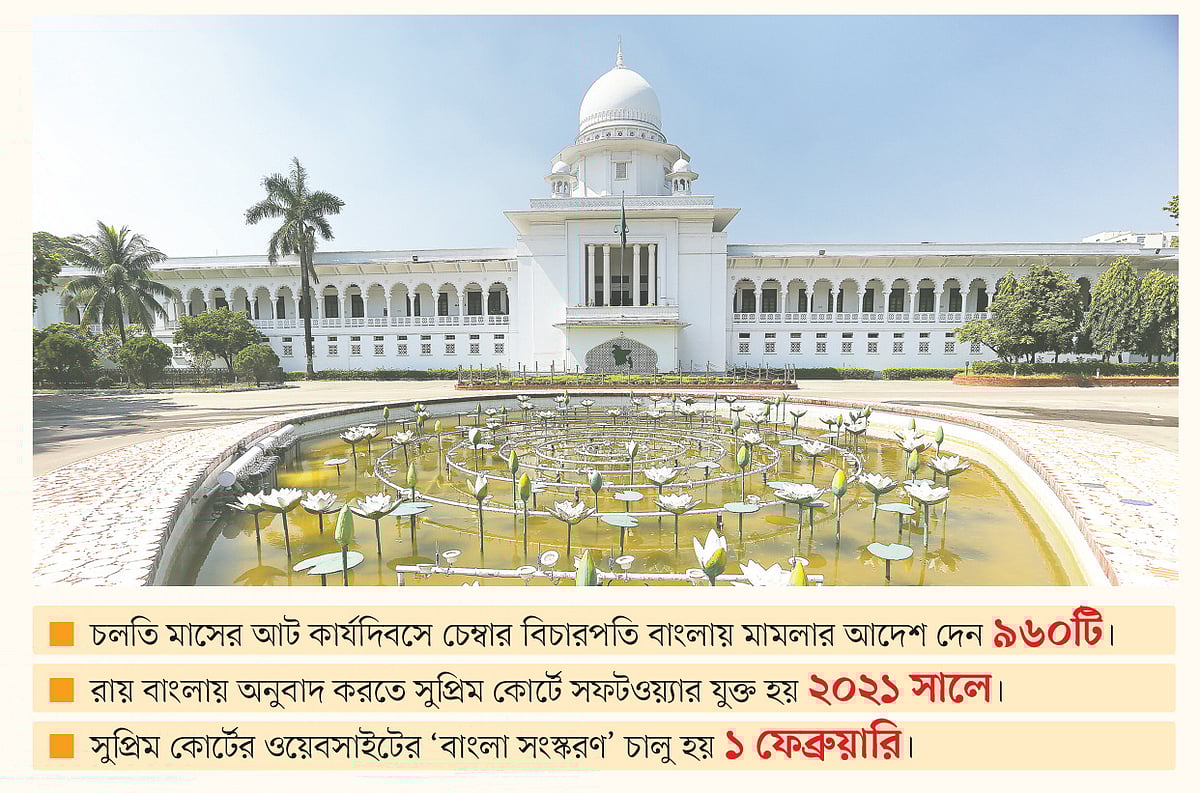 আশার বিষয়, বাংলায় রায়–আদেশ লেখার চর্চা বৃদ্ধির পাশাপাশি সুপ্রিম কোর্টের ওয়েবসাইটে ইংরেজিতে প্রকাশিত সব রায় ও আদেশ বাংলায় দেখতে গতকাল সোমবার থেকে নতুন প্রযুক্তিসেবা যুক্ত করা হয়েছে। এখন থেকে গুগল প্রযুক্তির মাধ্যমে বিচারপ্রার্থী ও আইনজীবী বা যেকোনো ব্যক্তি ওয়েবসাইটে ইংরেজিতে প্রকাশিত রায়-আদেশ বাংলায় অনুবাদ করে দেখতে পারবেন। এর আগে ভাষাশহীদদের প্রতি শ্রদ্ধা জানিয়ে ১ ফেব্রুয়ারি থেকে সুপ্রিম কোর্টের ওয়েবসাইটের ‘বাংলা সংস্করণ’ চালু করা হয়।