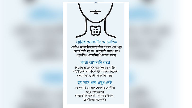 থাইরয়েড ক্যানসারের অস্ত্রোপচারের পর রোগীকে ক্যাপসুল আকারের এই ওষুধ খাওয়ানো হয়। রেডিও অ্যাকটিভ আয়োডিন (আরএআই) নামের এই ওষুধ দেশে তৈরি হয় না। বিদেশ থেকে আমদানি করা হয়। ওষুধটিতে তেজস্ক্রিয় উপাদান আছে। শুধু বিজ্ঞান ও প্রযুক্তি মন্ত্রণালয়ের অধীন বাংলাদেশ পরমাণু শক্তি কমিশন এই ওষুধ আমদানি করে। পরমাণু শক্তি কমিশন ঠিক সময়ে পদক্ষেপ না নেওয়ায় সংকটে পড়েছেন রোগীরা।