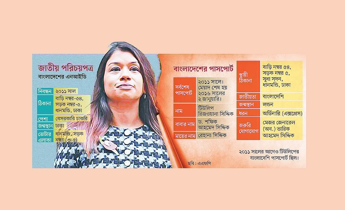 ব্রিটিশ পার্লামেন্টে ক্ষমতাসীন লেবার পার্টির প্রভাবশালী এমপি টিউলিপ রিজওয়ানা সিদ্দিক দাবি করে আসছেন, তিনি কেবলই ব্রিটিশ নাগরিক। কিন্তু প্রথম আলোর হাতে আসা নথিতে দেখা যাচ্ছে, টিউলিপের নামে বাংলাদেশের জাতীয় পরিচয়পত্র (এনআইডি) রয়েছে। তিনি এখানকার ভোটার। বাংলাদেশি পাসপোর্টও করেছিলেন তিনি। গণ-অভ্যুত্থানে ক্ষমতাচ্যুত প্রধানমন্ত্রী শেখ হাসিনার ভাগনি টিউলিপের বাংলাদেশি নাগরিকত্ব-সংক্রান্ত নথিগুলো নিয়ে প্রথম আলো ব্রিটিশ দৈনিক দ্য টাইমস-এর সঙ্গে যৌথভাবে কাজ করেছে। বাংলাদেশের সংশ্লিষ্ট সরকারি দপ্তরে যাচাই করে নথির সত্যতা পাওয়া গেছে।