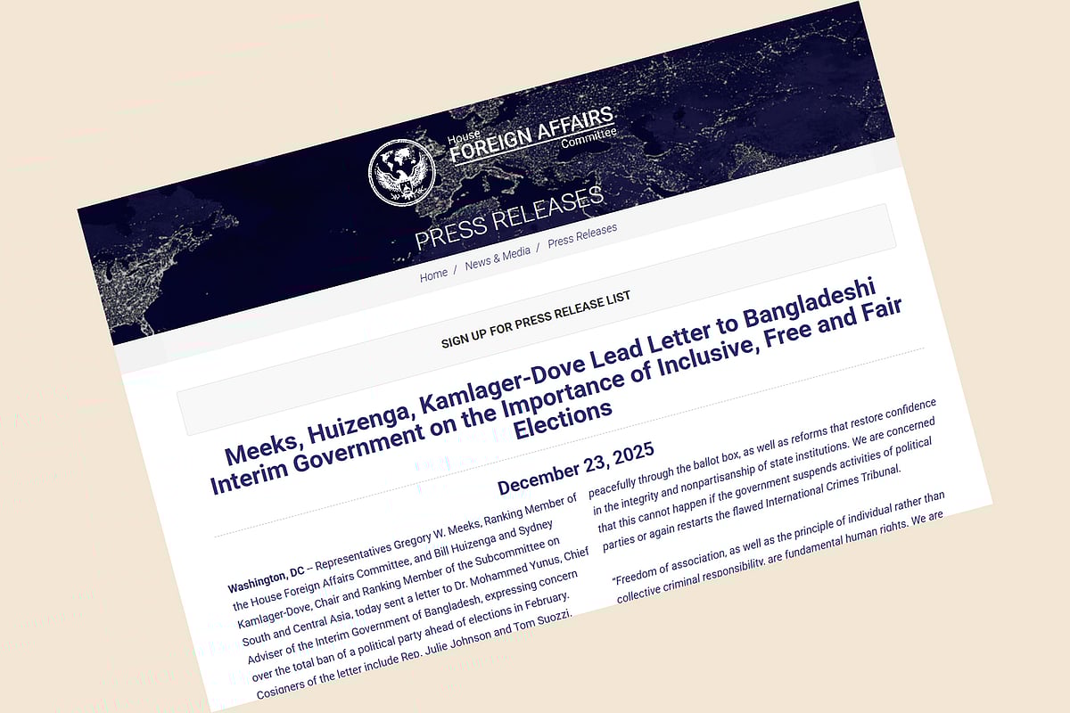 চিঠিতে আরও বলা হয়েছে, মার্কিন পররাষ্ট্র মন্ত্রণালয় ও অন্যান্য অনেক আন্তর্জাতিক পর্যবেক্ষক উল্লেখ করেছেন, বাংলাদেশে ২০১৮ ও ২০২৪ সালের সাধারণ নির্বাচন অবাধ ও সুষ্ঠু ছিল না। সেই সঙ্গে ফেব্রুয়ারির এক তথ্যানুসন্ধান প্রতিবেদনে জাতিসংঘের মানবাধিকারবিষয়ক হাইকমিশনারের দপ্তর অনুমান করেছে, ২০২৪ সালের জুলাই–আগস্টে বাংলাদেশে বিক্ষোভ চলাকালে নিরাপত্তা বাহিনীর হাতে প্রায় ১ হাজার ৪০০ জনের প্রাণ গেছে।