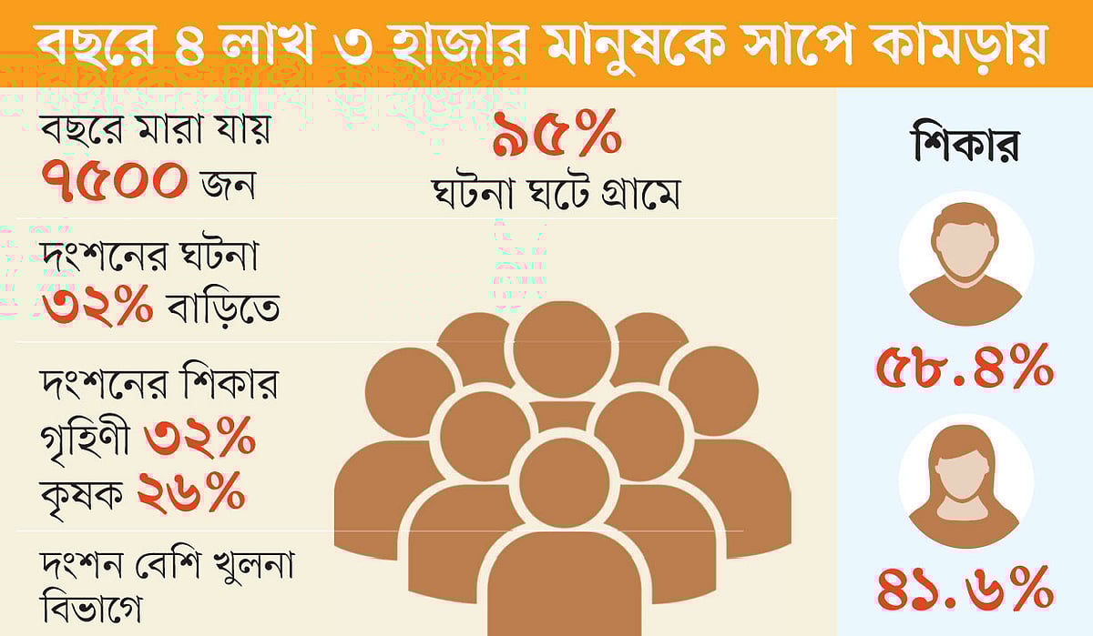 স্বাস্থ্য অধিদপ্তরের অসংক্রামক রোগ নিয়ন্ত্রণ শাখার এক গবেষণায় বলা হয়েছে, দেশে প্রতিবছর চার লাখ তিন হাজারের বেশি মানুষ সাপের কামড়ের শিকার হন। এর মধ্যে মারা যান সাড়ে সাত হাজারের বেশি মানুষ। গত মাসে রাজধানীর একটি পাঁচতারা হোটেলে এই গবেষণার ফল প্রকাশ করা হয়।