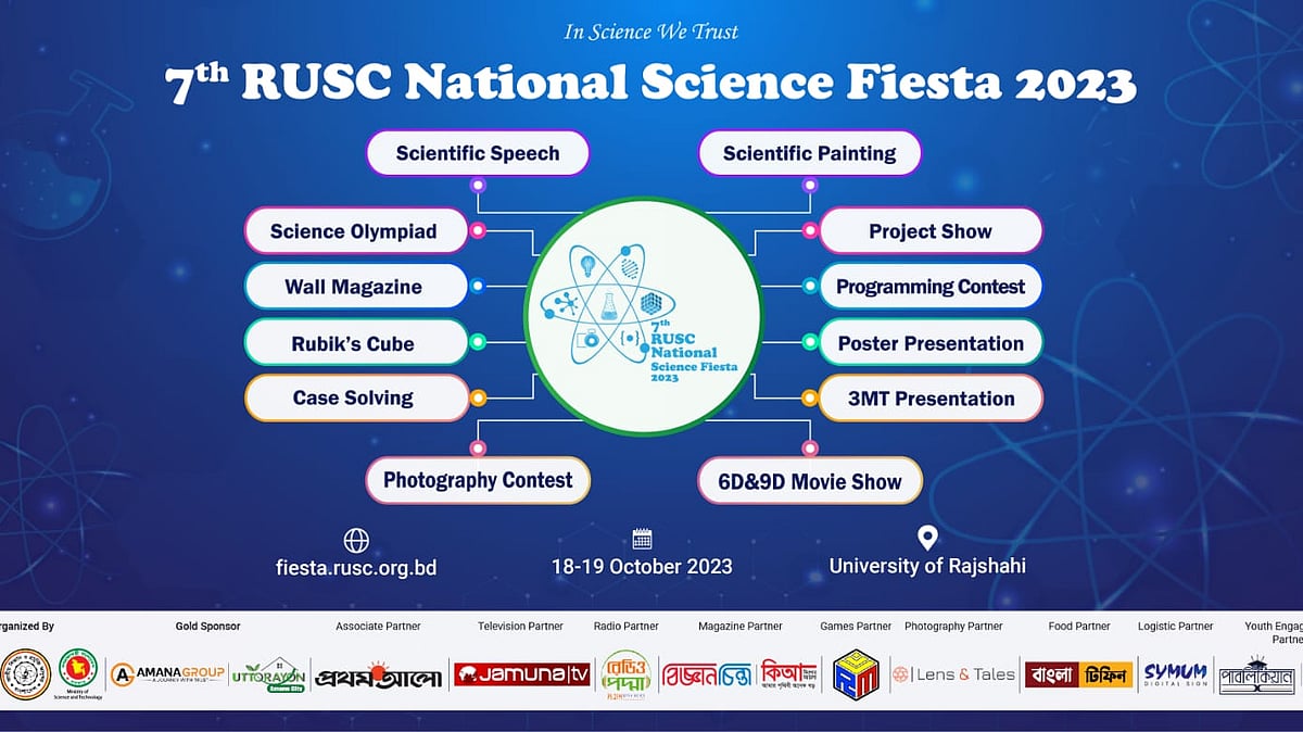 রাজশাহী বিশ্ববিদ্যালয়ে আগামী বুধবার (১৮ অক্টোবর) থেকে শুরু হচ্ছে আরইউএসসি ন্যাশনাল সায়েন্স ফিয়েস্টা ২০২৩। জাতীয় বিজ্ঞান ও প্রযুক্তি জাদুঘরের সহযোগিতায় রাজশাহী বিশ্ববিদ্যালয় সায়েন্স ক্লাব (আরইউএসসি) আয়োজিত দুই দিনব্যাপী এই উৎসব চলবে আগামী বৃহস্পতিবার পর্যন্ত। এই উৎসবে থাকবে ১০টি বিজ্ঞানবিষয়ক প্রতিযোগিতাসহ অন্যান্য ইভেন্ট।