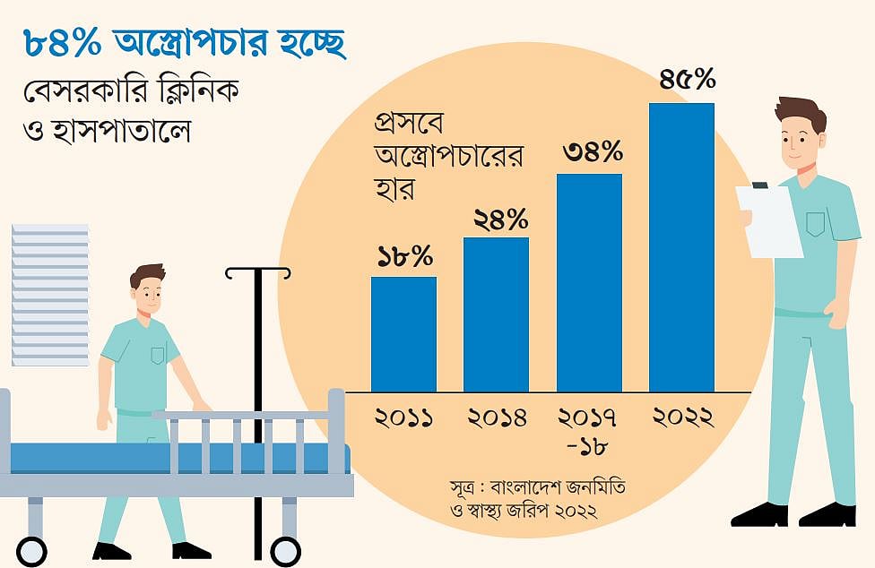 অপ্রয়োজনীয় অস্ত্রোপচারের এই পরিসংখ্যান পাওয়া গেছে সর্বশেষ বাংলাদেশ জনমিতি ও স্বাস্থ্য জরিপে (২০২২)। জরিপে আরও বলা হয়েছে, জাতীয়ভাবে মোট প্রজনন হার (টিএফআর) প্রায় এক দশক ধরে স্থির হয়ে আছে, সরকার তা