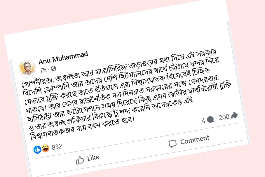 ‘গোপনীয়তা, অস্বচ্ছতা আর মাত্রাতিরিক্ত তাড়াহুড়ার মধ্য দিয়ে এই সরকার বিদেশি কোম্পানি আর তাদের দেশি হিটম্যানদের স্বার্থে চট্টগ্রাম বন্দর নিয়ে যেভাবে চুক্তি করছে, তাতে ইতিহাসে এরা বিশ্বাসঘাতক হিসেবেই চিহ্নিত থাকবে। আর যেসব রাজনৈতিক দল দিনরাত সরকারের সঙ্গে দেনদরবার, হাসিঠাট্টা আর ফটোসেশনে সময় দিয়েছে কিন্তু এসব জাতীয় স্বার্থবিরোধী চুক্তি ও তার অস্বচ্ছ প্রক্রিয়ার বিরুদ্ধে টুঁ শব্দ করেনি, তাদেরকেও এই বিশ্বাসঘাতকতার দায় বহন করতে হবে।’