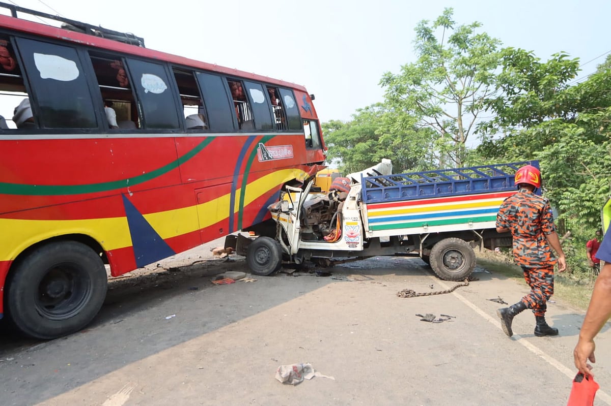 ফরিদপুরে আজ মঙ্গলবার সকালে বাস ও পিকআপ ভ্যানের মুখোমুখি সংঘর্ষে যে ১৩ জন নিহত হয়েছেন, তাঁদের মধ্যে আছেন মা ও মেয়ে। আজ সকাল পৌনে আটটার দিকে ঢাকা-খুলনা মহাসড়কে ফরিদপুর সদরের দিগনগর তেঁতুলতলা এলাকায় এ দুর্ঘটনা ঘটে।