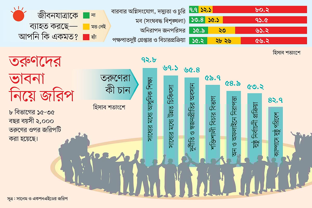 দেশের আইনশৃঙ্খলা পরিস্থিতি ও মব (সংঘবদ্ধ বিশৃঙ্খলা) নিয়ে উদ্বিগ্ন তরুণেরা। তাঁরা চান সাধ্যের মধ্যে আধুনিক শিক্ষা ও উন্নত স্বাস্থ্যসেবা। সংস্কারের ক্ষেত্রেও তাঁরা শিক্ষা, স্বাস্থ্য ও শ্রমবাজারকে অগ্রাধিকারে দেখতে চান।