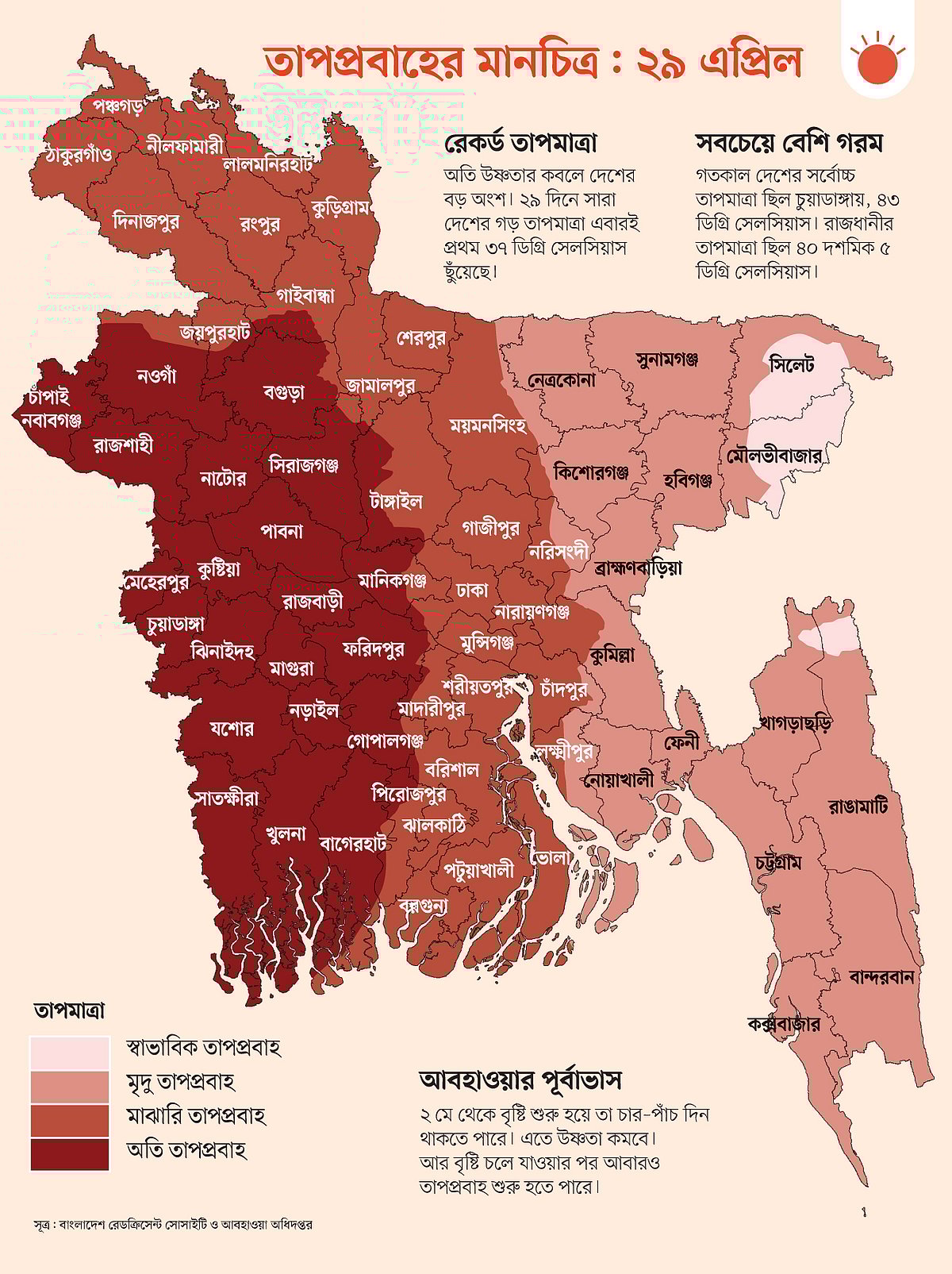 আবহাওয়া অধিদপ্তরের দেওয়া তথ্য বিশ্লেষণ করে এই চিত্র তুলে ধরেছে বাংলাদেশ রেড ক্রিসেন্ট সোসাইটি। সরকারের কাছে দেওয়া তাদের প্রতিবেদন থেকে জানা যায়, তাপপ্রবাহের কারণে সারা দেশের অন্তত ৭০ শতাংশ মানুষ সবচেয়ে কষ্ট ও বিপদে আছেন। এর বড় অংশ প্রচণ্ড গরমের কারণে দৈনন্দিন কাজ করতে পারছে না। অনেকে অসুস্থ হয়ে পড়ছেন।