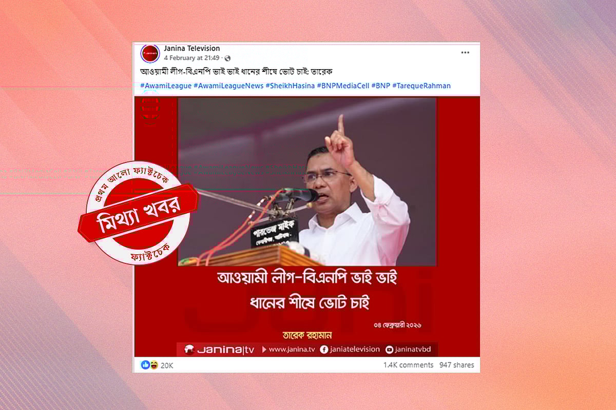 নির্বাচনের সরগরম প্রচারণার মধ্যে সামাজিক যোগাযোগমাধ্যমে বিএনপির চেয়ারম্যান তারেক রহমানের ছবিসহ একটি ফটোকার্ড তৈরি করা হয়েছে, যেখানে দাবি করা হয়েছে যে তিনি বলেছেন, ‘আওয়ামী লীগ-বিএনপি ভাই ভাই, ধানের শীষে ভোট চাই।’ আসলে এমন কোনো কথা তিনি বলেননি। একটি স্যাটায়ার পেজের পোস্ট থেকে এ বক্তব্য ছড়িয়ে বিভ্রান্তি তৈরি করা হচ্ছে।