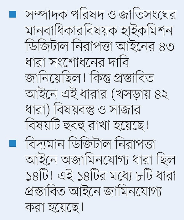 এমনকি ডিজিটাল নিরাপত্তা আইন নিয়ে জাতিসংঘের মানবাধিকারবিষয়ক কমিশন, সম্পাদক পরিষদসহ বিভিন্ন সংগঠনের যেসব আপত্তি-উদ্বেগ ছিল, প্রস্তাবিত নতুন আইনেও সেসব দূর করা হয়নি। শুধু কিছু ক্ষেত্রে সাজা কমেছে এবং জামিনযোগ্য ধারা বেড়েছে।