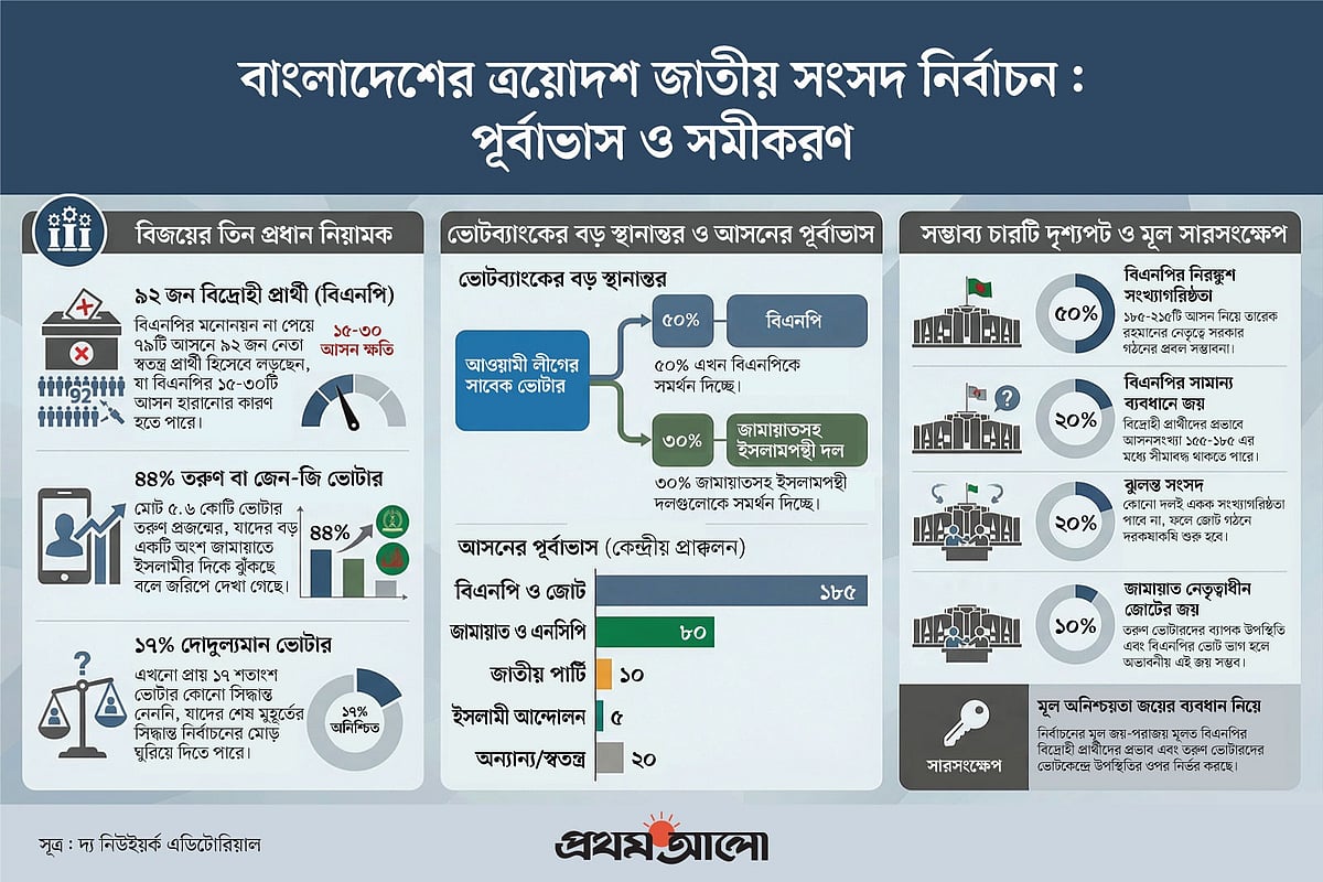 আমাদের (দ্য নিউইয়র্ক এডিটোরিয়াল কর্তৃপক্ষের) মূল পূর্বাভাস বলছে, ১২ ফেব্রুয়ারির নির্বাচনে তারেক রহমানের নেতৃত্বে বিএনপি প্রায় ১৮৫টি আসনে জয়ী হয়ে দেশের পরবর্তী সরকার গঠন করতে যাচ্ছে। অন্যদিকে জামায়াতে ইসলামী তাদের ইতিহাসের সেরা ফলাফল অর্জন করতে পারে। তাদের সম্ভাব্য আসনসংখ্যা হতে পারে ৬০ থেকে ১০০টি। এর মাধ্যমে দলটি নিজেকে দেশের প্রধান বিরোধী শক্তি হিসেবে প্রতিষ্ঠিত করবে; যা আগামী এক প্রজন্মের জন্য বাংলাদেশের রাজনৈতিক মানচিত্রকে নতুন করে বদলে দেবে।