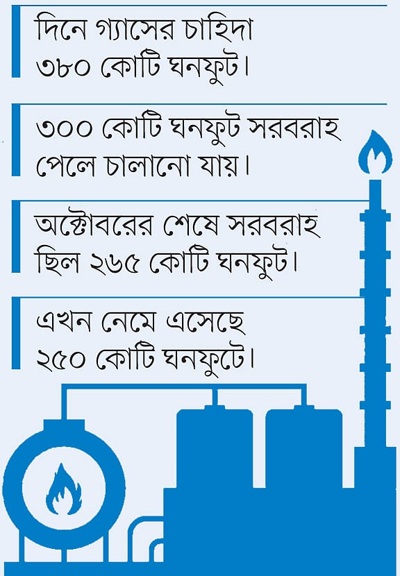 পেট্রোবাংলা বলছে, নভেম্বরে এলএনজি সরবরাহ কমলেও গ্যাসের সংকট হয় না সাধারণত। গত বছর এ সময়ে এলএনজি থেকে দিনে সরবরাহ করা হয়েছে ৪০ থেকে ৪৫ কোটি ঘনফুট। এখন সরবরাহ করা হচ্ছে ৫০ কোটি ঘনফুট। গত বছরের চেয়ে এবার দেশীয় গ্যাসক্ষেত্র থেকে ১৫ কোটি ঘনফুটের মতো উৎপাদন কমে গেছে। এ ছাড়া বিদ্যুৎ উৎপাদন খাতে গত বছর সরবরাহ করা হয়েছে ৮০ কোটি ঘনফুট। এখন দেওয়া হচ্ছে ৯০ কোটি ঘনফুট। তাই এ বছর শিল্পের চাহিদা পূরণ করা যাচ্ছে না।