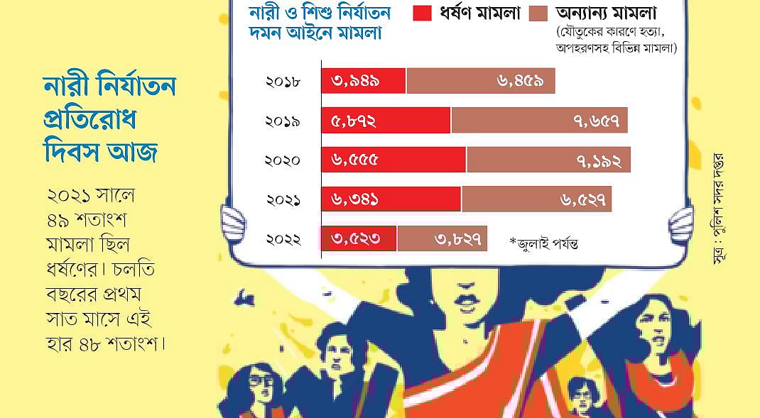 চলতি বছরের প্রথম সাত মাসে দেশে নারী ও শিশু নির্যাতনের অভিযোগে দায়ের হওয়া মামলার প্রায় অর্ধেক ধর্ষণের। পাঁচ বছর ধরে ধর্ষণের মামলার হার বেড়েই চলছে। আইনের যথাযথ প্রয়োগের অভাব, বিচারপ্রক্রিয়ার দুর্বলতা, দীর্ঘসূত্রতা এবং দোষীদের বিচার না হওয়ার সংস্কৃতির কারণে ধর্ষণের ঘটনা বাড়ছে বলে বিশেষজ্ঞরা মনে করেন।