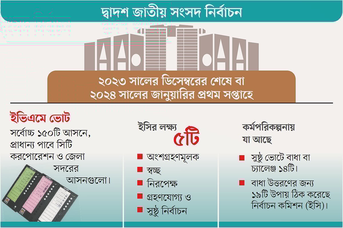 ইসি বলছে, ব্যালটে ভোট হলে কেন্দ্র দখল করে কারচুপি হয়। তাহলে যে ১৫০ আসনে ব্যালটে ভোট হবে সেগুলো নিয়ে শঙ্কা থেকে যায় কি না, এমন প্রশ্নের জবাবে নির্বাচন কমিশনার মো. আলমগীর বলেন, যে আসনগুলোতে ইভিএমে হবে সেগুলো নিরাপদ করা হলো। বাকি আসনে ফোর্স (আইনশৃঙ্খলায় নিয়োজিত সদস্য) বেশি খাটানো যাবে। ইসির হাতে তিন–চার বছর সময় থাকলে ৩০০ আসনেই ইভিএমে ভোট করা হতো। ৩০০ আসনে ব্যালটে ভোট হলে ‘রিস্ক’ (ঝুঁকি) অবশ্যই বেশি। এমনও হতে পারে, সে ক্ষেত্রে একাধিক দিনে ভোট করা হবে।