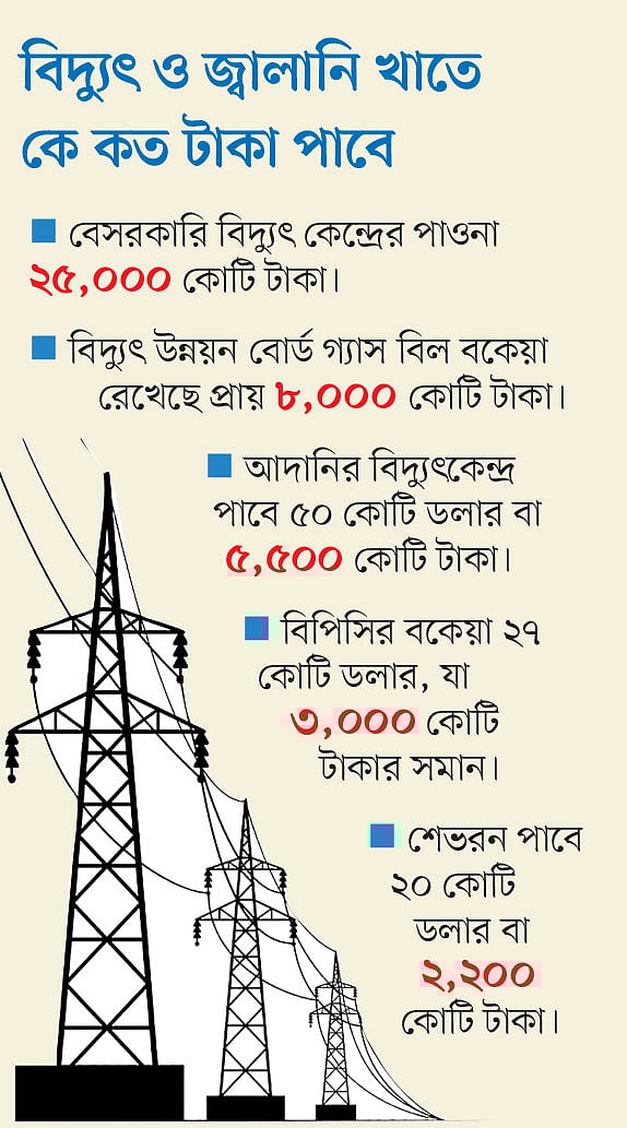 ভারতের আদানির কাছে বিদ্যুতের দাম বকেয়া পড়েছে ৫০ কোটি ডলারের মতো (প্রায় সাড়ে ৫ হাজার কোটি টাকা)। জ্বালানি তেল আমদানিকারক সরকারি প্রতিষ্ঠান বাংলাদেশ পেট্রোলিয়াম করপোরেশনের (বিপিসি) কাছে বিদেশি সরবরাহকারীরা পাবে প্রায় ২৭ কোটি ডলার (প্রায় ৩ হাজার কোটি টাকা)। আর বাংলাদেশে গ্যাস উত্তোলনকারী মার্কিন কোম্পানি শেভরন গ্যাসের দাম বাবদ পাবে ২০ কোটি ডলার (প্রায় ২ হাজার ২০০ কোটি টাকা)।