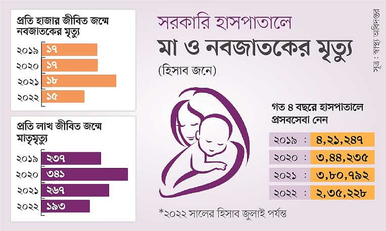 স্বাস্থ্য অধিদপ্তরের তথ্য বিশ্লেষণে দেখা যায়, করোনার ঊর্ধ্বগতির দুই বছরে হাসপাতালে এসে প্রসবসেবা নেওয়ার হার ১০ থেকে ১৮ শতাংশ কমেছিল। তবে হাসপাতালে সেবা নেওয়ার হার এখন আবার বেড়েছে। ফলে চলতি বছর মৃত্যুহারও কমে এসেছে। ২০১৯ সালের তুলনায় চলতি বছরের জানুয়ারি থেকে জুলাই পর্যন্ত সাত মাসে মাতৃমৃত্যু ১৯ শতাংশ এবং নবজাতকের মৃত্যু ১২ শতাংশ কমেছে।