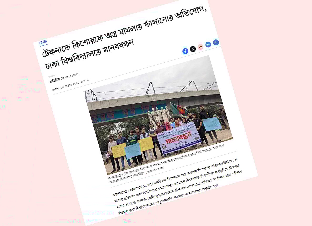 ‘টেকনাফে কিশোরকে অস্ত্র মামলায় ফাঁসানোর অভিযোগ, ঢাকা বিশ্ববিদ্যালয়ে মানববন্ধন’ শিরোনামে গত ৩০ নভেম্বর প্রথম আলোয় প্রতিবেদন প্রকাশিত হয়। এটিসহ ওই কিশোরকে নিয়ে বিভিন্ন গণমাধ্যমে আসা প্রতিবেদন আইন ও সালিশ কেন্দ্রের (আসক) পক্ষে আইনজীবী সৈয়দা নাসরিন গতকাল সকালে আদালতে তুলে ধরেন।