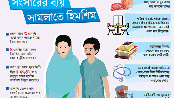 আবু আজাদ রহমান প্রথম আলোকে বলেন, নিত্যপণ্যের দাম এতটা বেড়েছে যে সংসারের ব্যয় সামলাতে হিমশিম খেতে হচ্ছে। তাই এখন মাছ ও মাংস কেনা কমিয়ে দিয়েছেন। ভাজি, ভর্তা, ডাল দিয়ে দুপুর ও রাতের খাবার খেতে হয়। আগে প্রতিদিন সকালে দুই সন্তানের জন্য নিয়ম করে দুটি ডিম রাখতেন। এখন সপ্তাহে তিন দিনের বেশি ডিম খেতে দিতে পারছেন না।