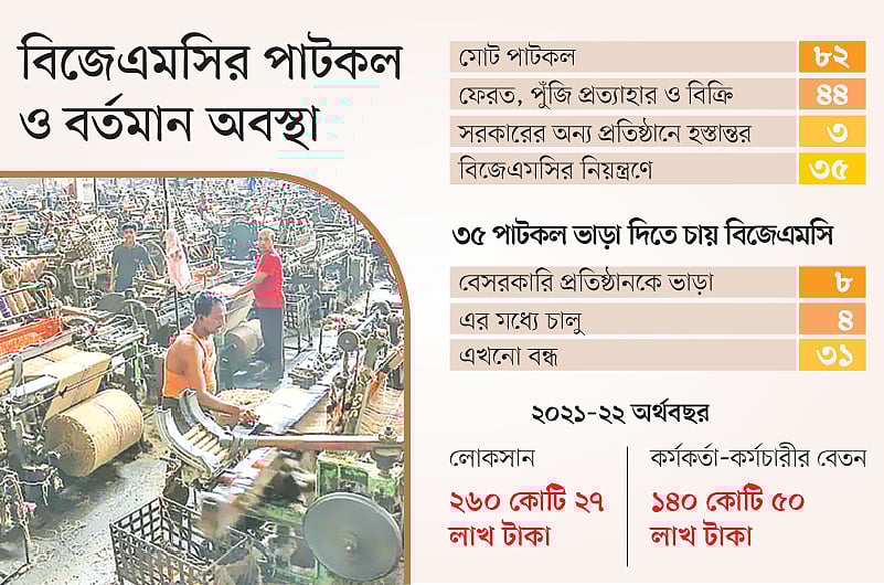 ২০২০ সালে সর্বশেষ ২৫টি পাটকল বন্ধের পর আর কোনো কারখানা চালাচ্ছে না বিজেএমসি। এর মধ্যে বেসরকারি খাতে ভাড়া দিয়ে চারটি কারখানা চালু রেখেছে।
